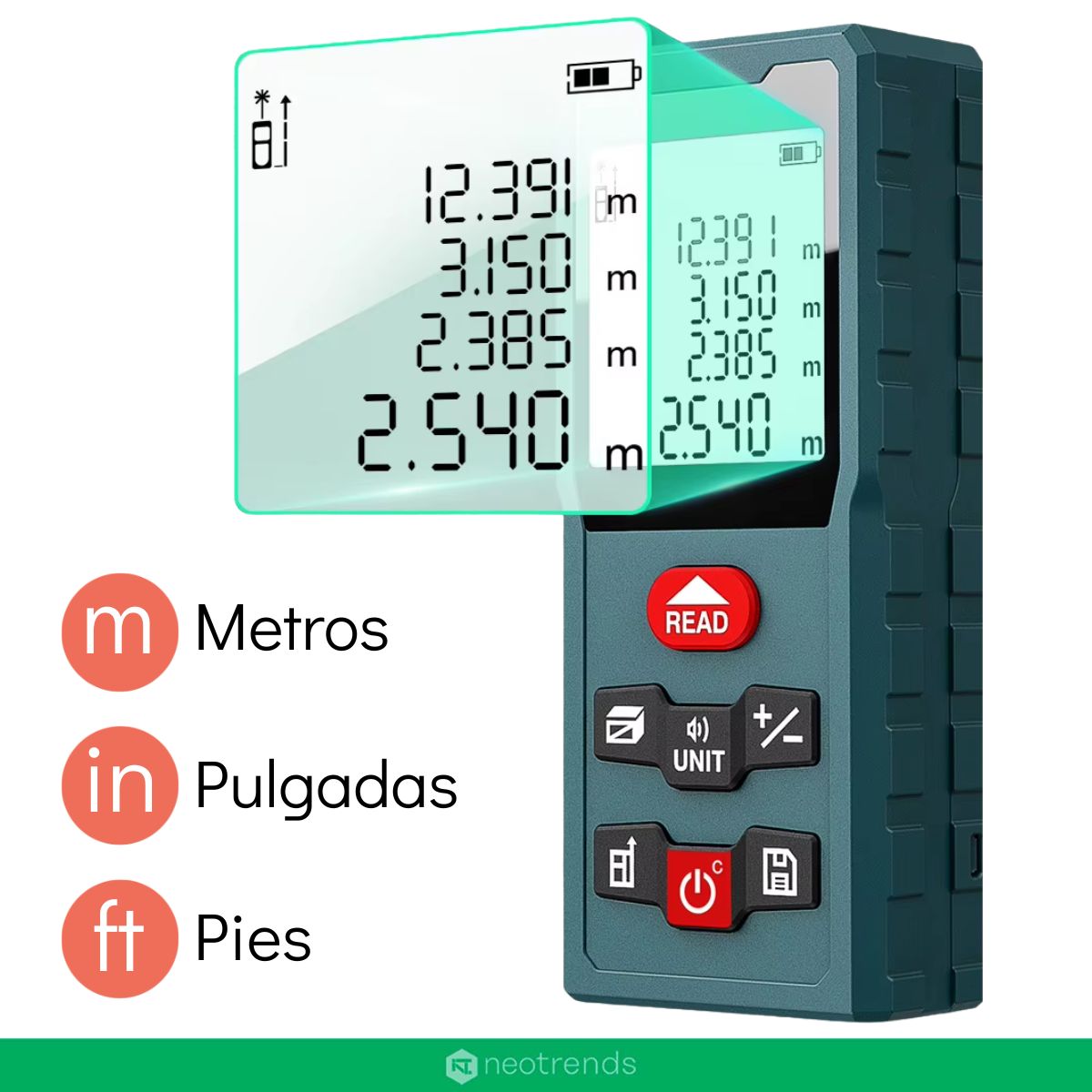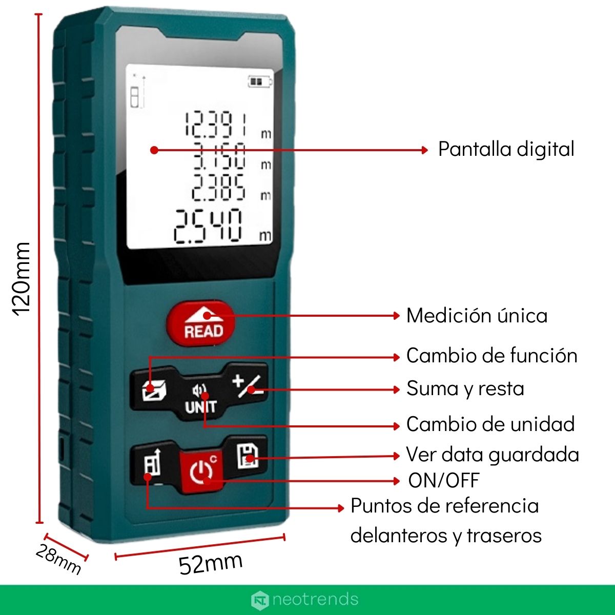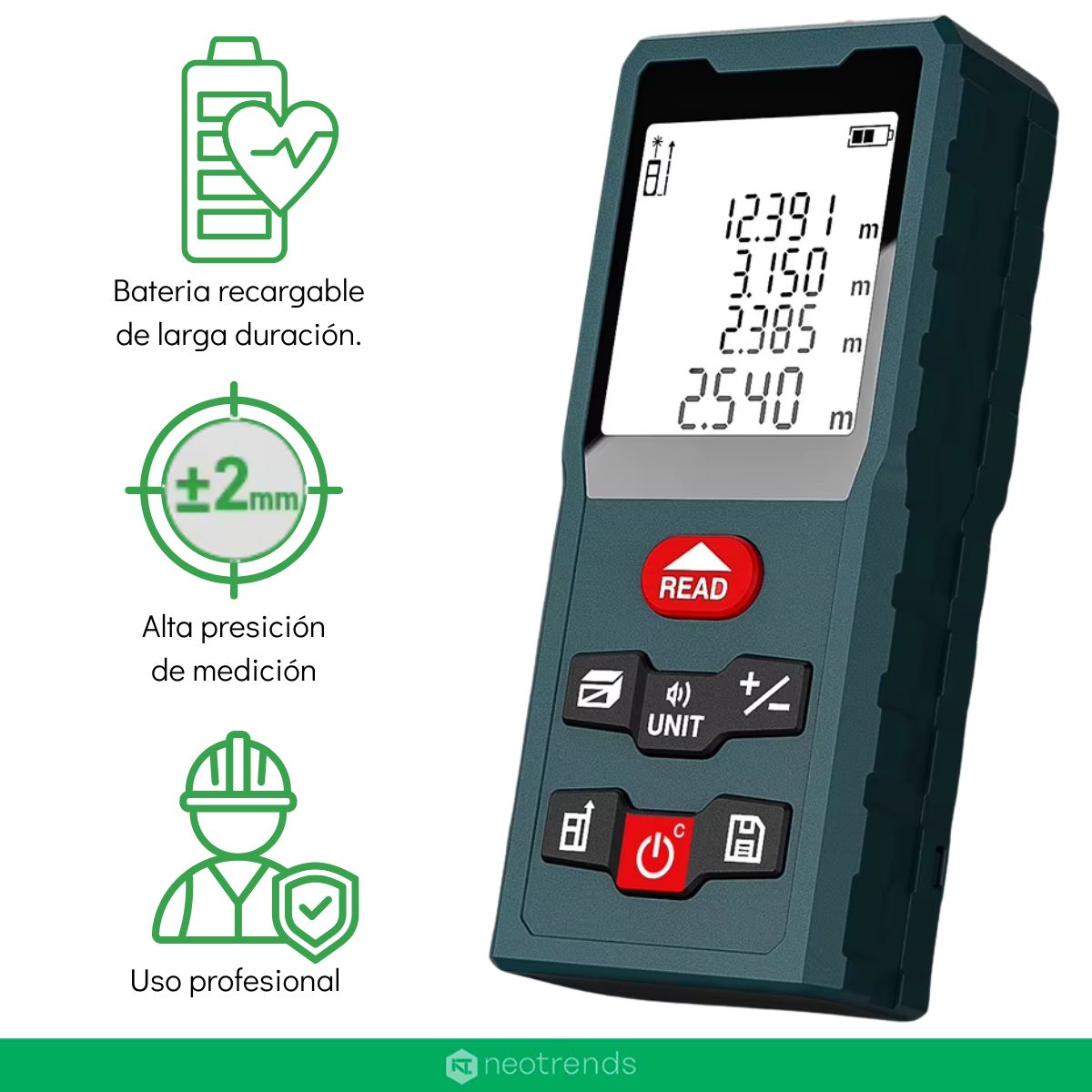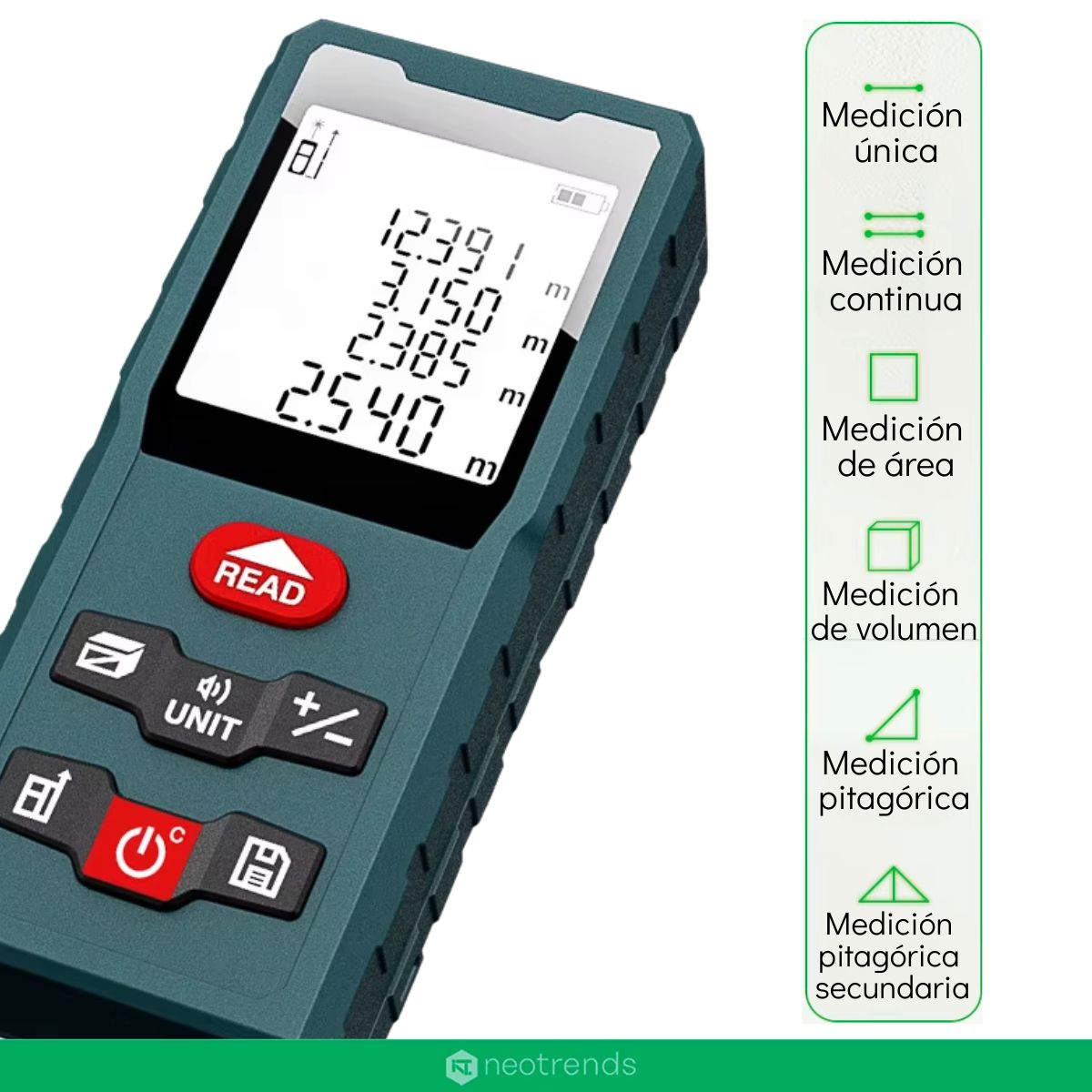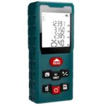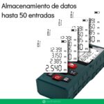 Este medidor no solo mide distancias: también calcula áreas y volúmenes automáticamente, y permite usar la modalidad de medición indirecta mediante el Teorema de Pitágoras, perfecto para determinar alturas o distancias inaccesibles. Además ofrece funciones útiles como medición continua, guardado de datos, suma/resta de mediciones, y cambio de unidades (metros, pulgadas, pies).
