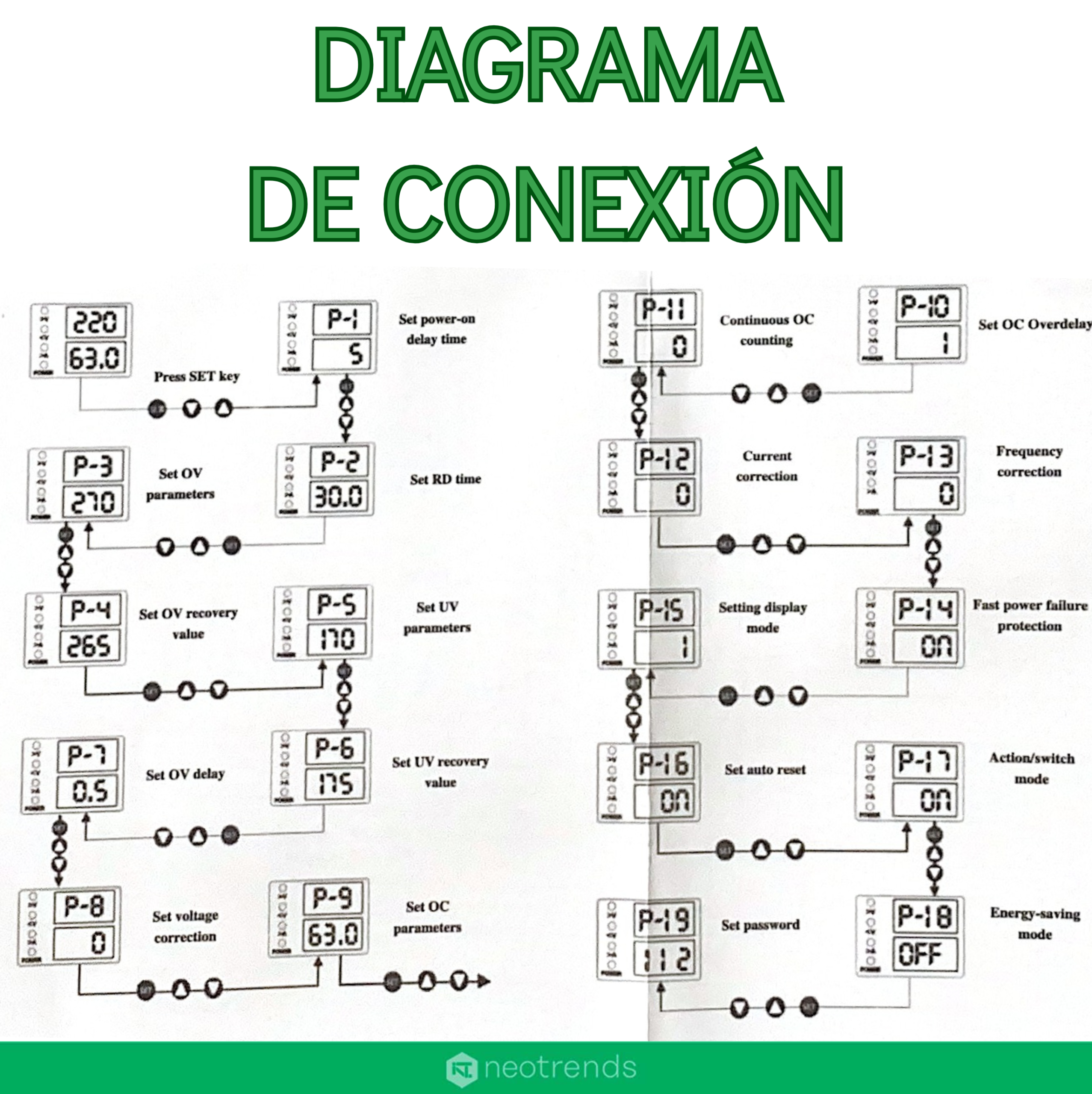 • Amplio voltaje (OV 130-300v, UV 80-210v. En caso de un seteo erroneo se enciende la luz de error)